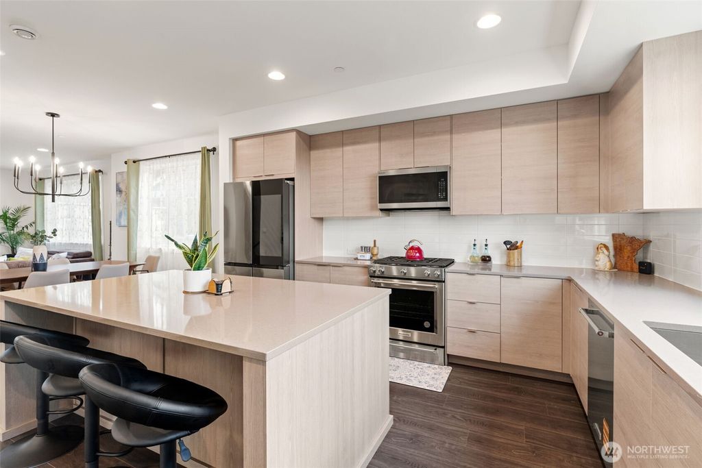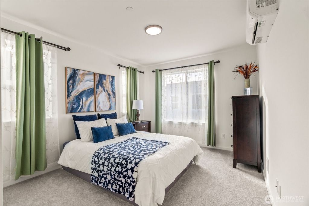 Discover modern luxury in this brand-new MainVue resale at Elmbrook — an east-facing, park-front Spruce floorplan showcasing style and comfort across three levels. This desirable end unit offers an inviting extended covered porch, foyer, and a guest suite on the entry level. The main floor features a gourmet kitchen with Quartz countertops, European frameless cabinetry, KitchenAid appliances, walk-in pantry, and a convenient study nook. Enjoy year-round comfort with air conditioning and relax on the covered deck overlooking the park. Upstairs, the primary suite boasts a spa-inspired bath and walk-in closet. Perfectly located across from Fernwood Elementary and near North Creek High—a must-see modern gem!