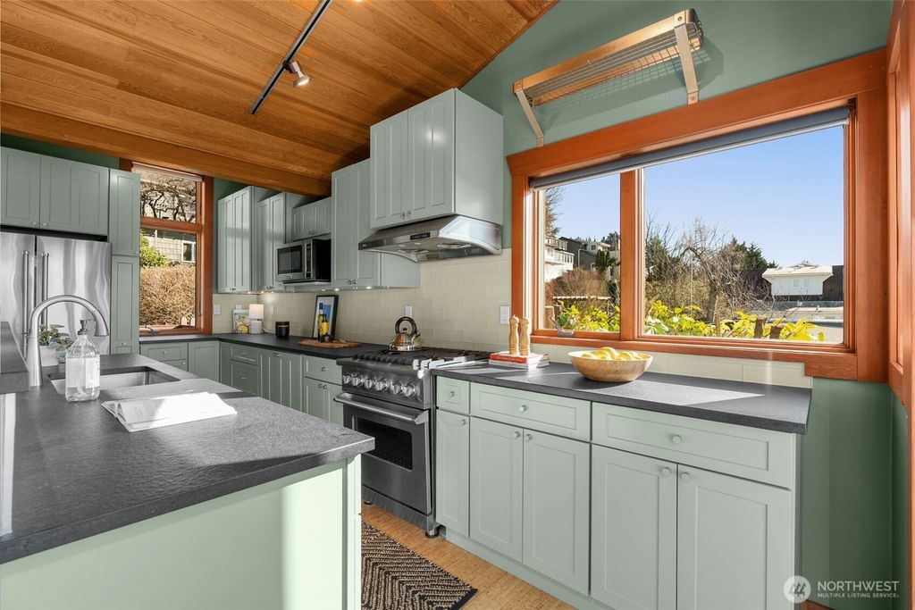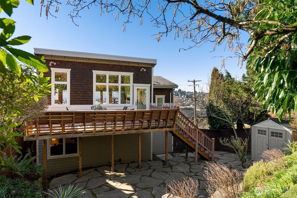 Sweeping views of the Puget Sound and Olympic Mountains take center stage, while this move-in ready home sits up high on a quiet corner lot, offering both privacy and a beautifully connected, light-filled layout. Located in the heart of Queen Anne, just moments from neighborhood shops, restaurants, parks, and groceries, it offers everyday convenience wrapped in community charm. The open floor plan seamlessly unites the living, dining, and kitchen spaces, creating an inviting setting for gathering. The chef’s kitchen features stainless appliances, a gas range, bar seating, and refined finishes. Cedar vaulted ceilings, expansive windows, and a cozy gas fireplace add character and comfort, while modern mini-splits provide efficient year-round AC. Step onto the west-facing deck for sunset views, or head to the back deck—perfect for BBQs, outdoor movie nights, and easy evenings with friends. With effortless indoor-outdoor flow and generous entertaining spaces, this home truly shines when hosting, from lively dinner parties to relaxed weekend get-togethers. The expansive primary suite offers a peaceful retreat with a walk-in closet and built-in desk. Heated floors and a jetted shower elevate the bath. A fully fenced yard, oversized garage, and abundant storage complete the package. More than just a house, this is a home that has been deeply cared for and thoughtfully lived in. Opportunities like this don’t come often—see it before it’s gone.