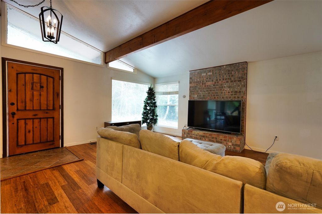 Beautifully Mid-Century home set on 3.8 private acres in South Hill. This light-filled residence features vaulted ceilings and an open-concept layout connecting the living, dining, and kitchen areas—perfect for modern living and entertaining. Kitchen offers granite countertops, premium cabinetry, and high-end appliances. Stylish bamboo and ceramic flooring run throughout the home. Step outside to the wraparound deck overlooking the expansive property—an ideal setting to relax and enjoy the peaceful surroundings. The spacious primary suite includes a luxurious 5-piece spa-inspired bath and walk-in closet. The lower level features a second kitchen with tile flooring, plus space ready for a future bath and second laundry. Oversized garage and additional parking pad provide plenty of room for vehicles, RV, or equipment. The level acreage is zoned with potential for future subdivision, offering excellent long-term investment or development opportunities.